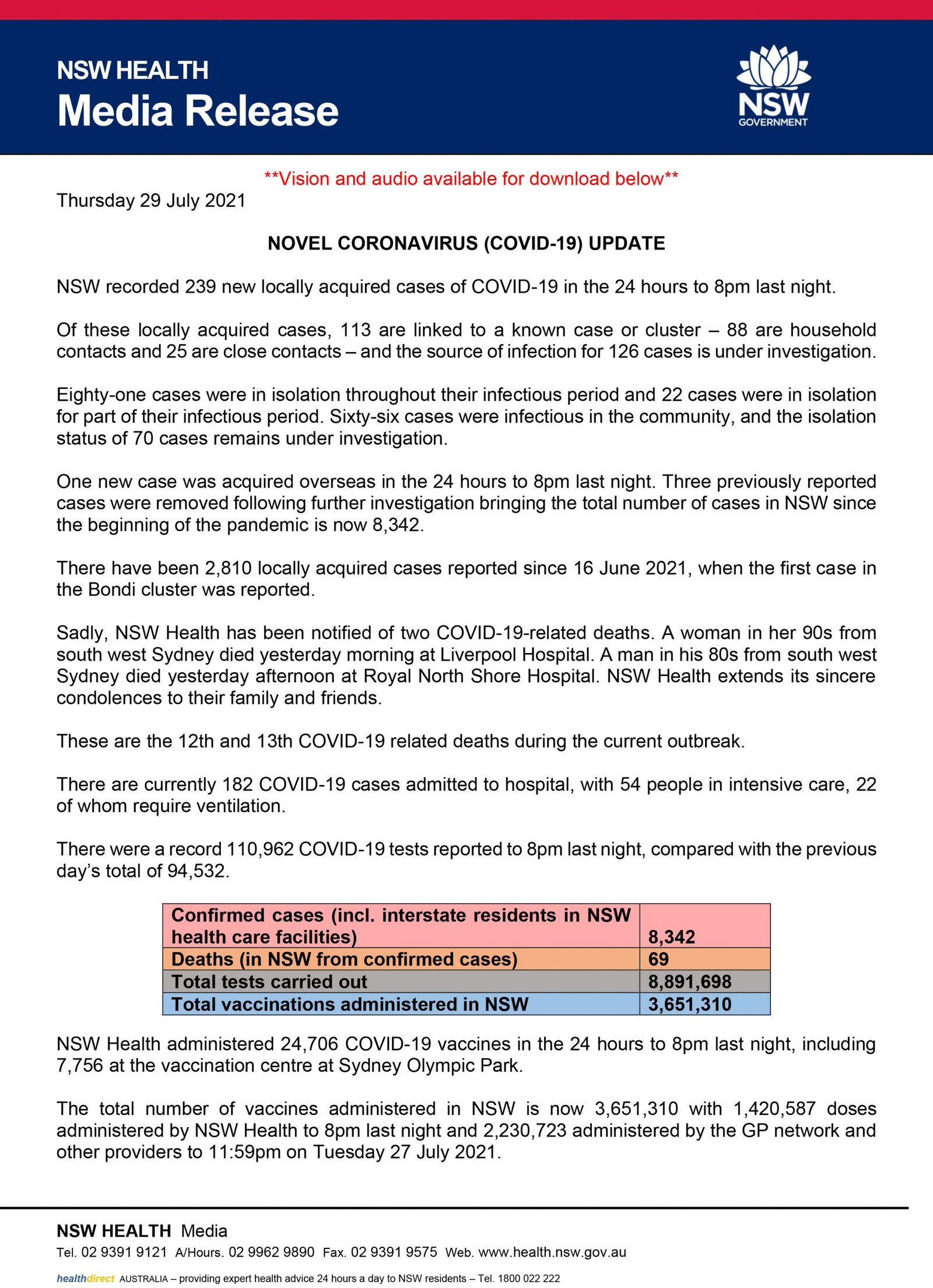 NOVEL CORONAVIRUS (COVID-19) UPDATE – Thursday 29 July 2021