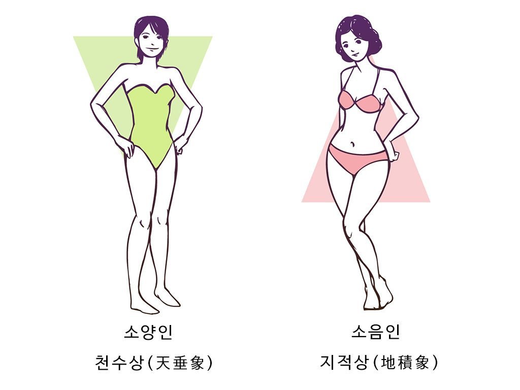 소음인과 소양인은 서로 상반된 체형을 가지고 있습니다. 소양인은 하체보다 상체가 발달한 천수상天垂象 (역삼각형)의 형태입니다. 반면 소음인은 상체보다 하체가 발달한 지적상地積象 (삼각형)의 몸매를 갖습니다. 천수상과 지적상은 형상학에서 남녀의 특징을 설명하는 개념입니다. 긴 설명이 필요해서 다음에 시간을 내서 다뤄보도록 하겠습니다.
