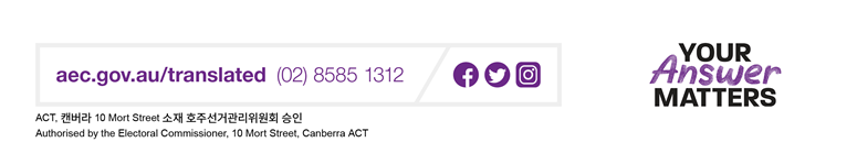 34개 언어로 번역된 자료를 aec.gov.au/translated 에서 확인할 수 있으며, 한국어 전화 통역 서비스는 1300 720 468번으로 이용할 수 있습니다