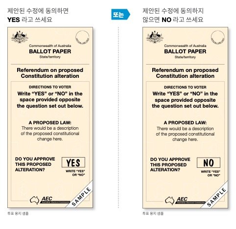 투표하러 가면 하나의 질문이 적힌 투표용지 한 장을 받게 됩니다. 이 질문은 헌법 개정안에 대한 찬반 여부를 묻는 것입니다. 투표용지에는 ‘Yes’ 또는 ‘No’를 주어진 칸에 영문으로 분명하게 기재하여 당신의 의사를 표시해야 합니다.